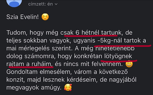 “A program tényleg alapos, de egyáltalán nem túlterhelő. Hétről hétre annyi mindent tisztába tettünk, amire korábban nem is gondoltam, hogy fontos lehet, ha le akarok fogyni. Most már értem, miért akadtam el mindig, és miért éreztem annyira nehéznek az egészet. Sokat segít az is, hogy végre tudom, mik a valódi prioritások, és hogy bármilyen élethelyzetbe kerülök – akár másik munka, akár utazás vagy bármi – átlátom, mi az, ami tényleg jó nekem, és mit érdemes csinálnom.”